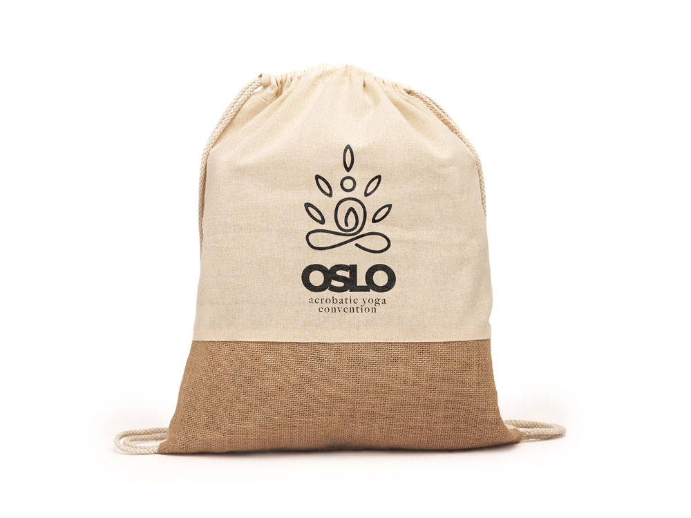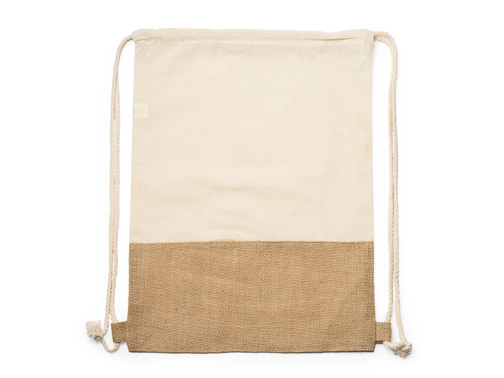 Рюкзак-мешок Eco line из хлопка и джута плотностью 120 г/м². Натуральный цвет. Спереди рюкзак имеет джутовую ленту на нижней части.