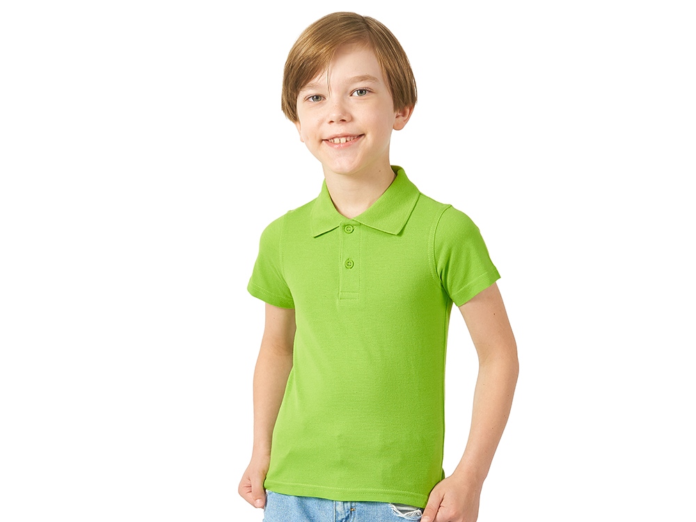 Детская рубашка поло First. Воротник 1х1. Обшивка внутри воротника. Мужская и детская модели с 2 пуговицами, женская — с 4 пуговицами. Пуговицы с гравировкой в тон. Пике, 100% хлопок. 160 г/м².