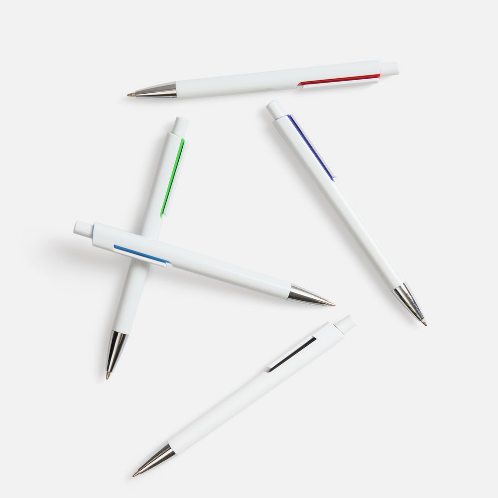 Шариковая ручка с глянцевым белым корпусом и цветовым акцентом у клипа, который дополнит логотип компании.