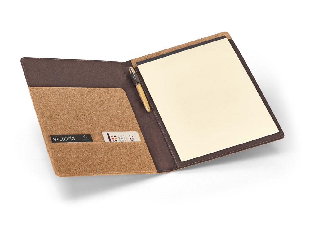 Папка A4 из натуральной пробки, с блокнотом из 20 чистых листов слоновой кости, держателем для шариковой ручки (ручка не входит в комплект) и резинкой. Поставляется в нетканом чехле. 239 x 307 x 17 мм | Сумка: 285 x 350 мм. Вид нанесения, рекомендуемый поставщиком: трансфер, гравировка, трафаретная печать.
