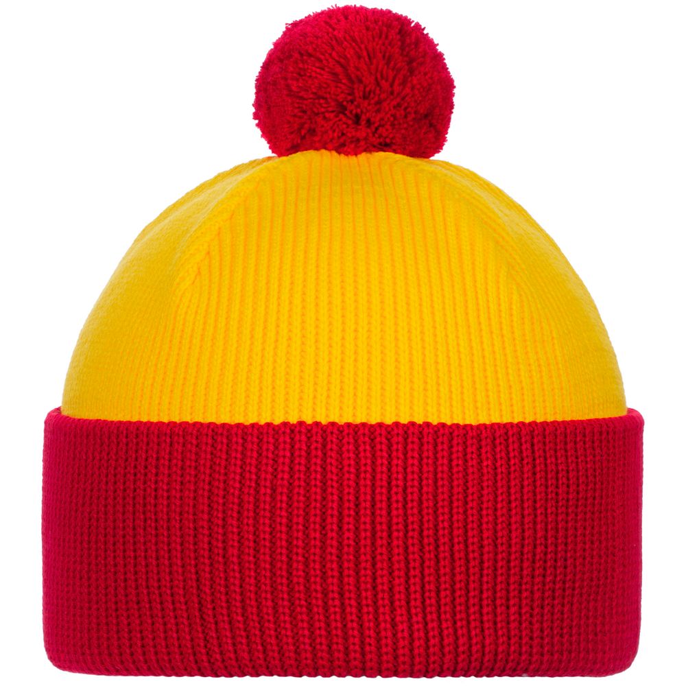Двуслойная шапка фактурной вязки с контрастным подворотом и помпоном.