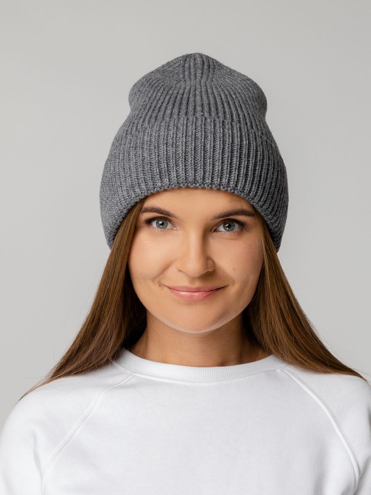 Шапка-бини из полушерстяной пряжи актуальных приглушенных оттенков. Трендовый фасон с удлиненным верхом — для расслабленного повседневного образа.