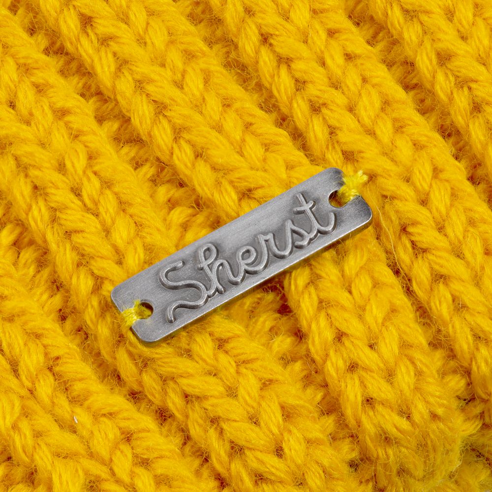 Металлический шильд с названием бренда расположен у заднего шва шапки. Это оставляет место спереди для пришива лейбла или шильдика с логотипом заказчика.
