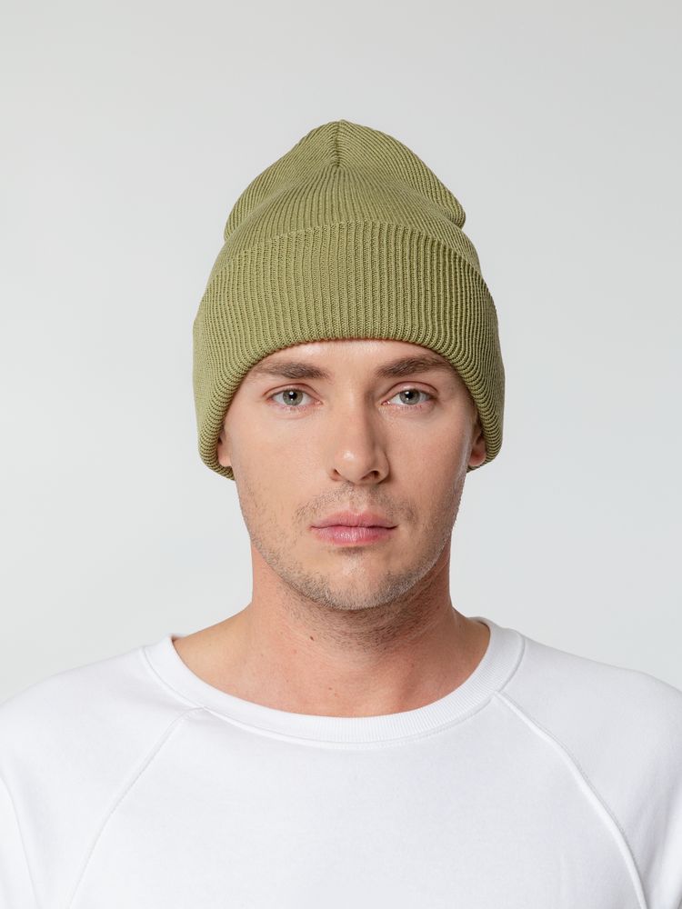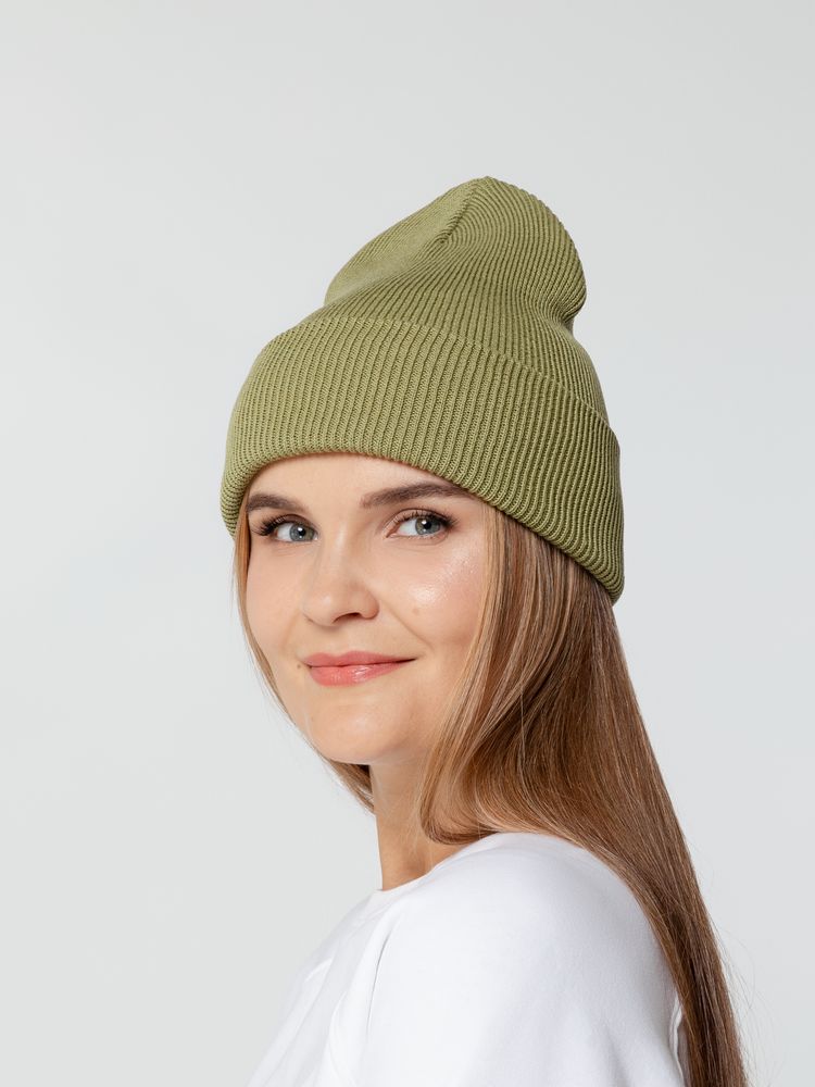 Двухслойная шапка, связанная резинкой, с широким отворотом.