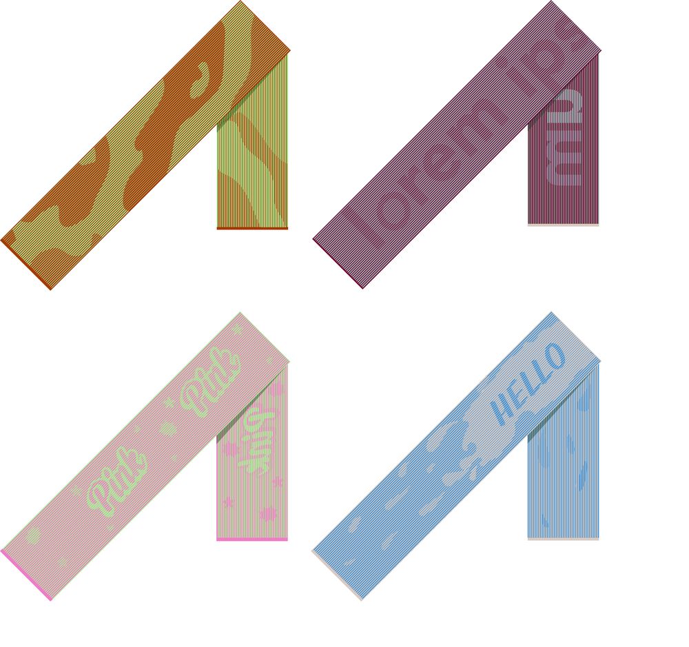 Модель: шарф с жаккардовым узором, рисунчатый эффект получается за счет смены петель. Вязание возможно только в 2 цвета: рисунок читается с обеих сторон шарфа, но на обратной стороне происходит инверсия цвета — текст оказывается в зеркальном отражении. Модель не имеет швов, вяжется единым полотном. Имеет лицевую и изнаночную сторону.