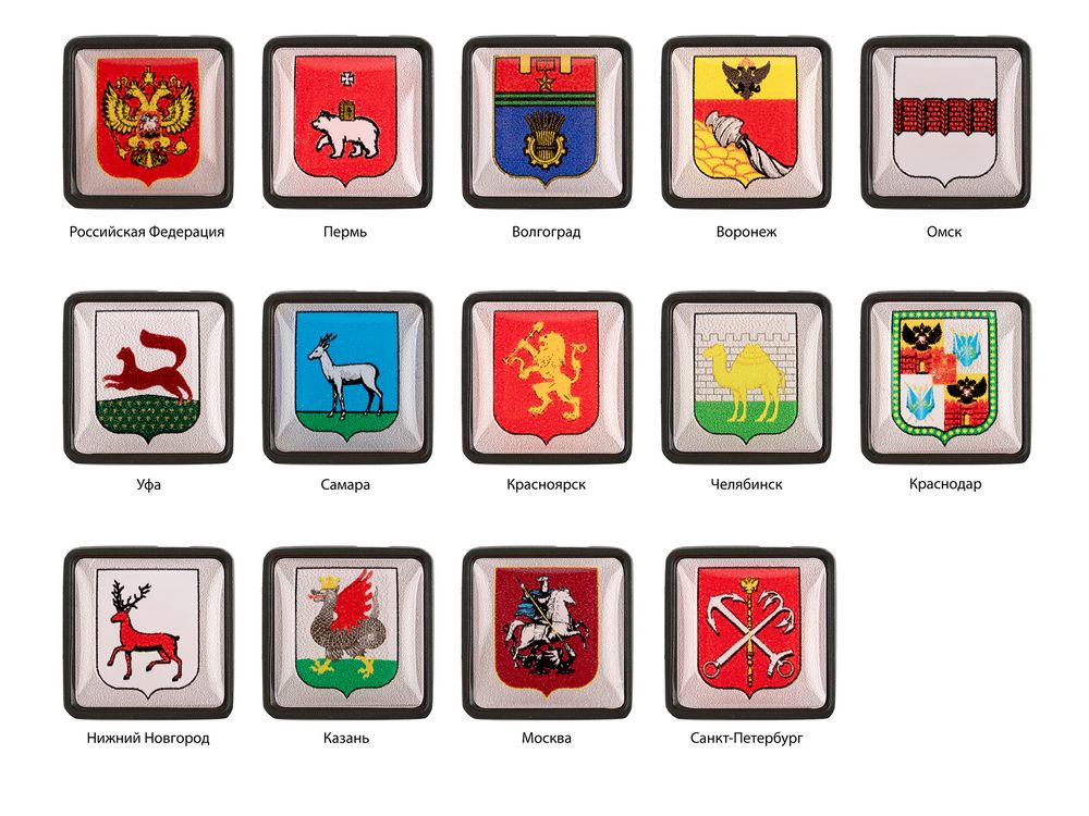 Металлический шильдик с объемной наклейкой под смолой с изображением герба одного из 14 крупных городов Российской Федерации — простой и элегантный способ показать региональную принадлежность компании, обозначить расположение филиалов или напрямую обратиться к клиентам из определенного города.