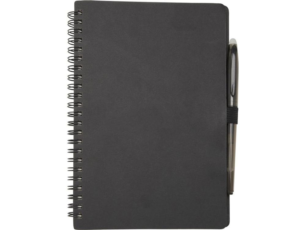 Многоразовый набор из ручки и блокнота в мягкой обложке из каменной бумаги. Блокнот имеет обложку из картона, закругленные углы и 32 листа линованной бумаги плотностью 120 г/м². В производстве каменной бумаги не используется дерево, а на сам процесс изготовления затрачивается гораздо меньше энергии в сравнении с производством переработанной или целлюлозной бумаги. Сзади имеется карман для хранения черной протирочной ткани (входит в комплект). Ручка из переработанного пластика с стираемыми чернилами, прозрачным корпусом, белым ластиком сверху и однотонной цветной рукояткой. Цвет чернил: черный. Длина непрерывной линии: 250 метров. Размер пера: 0,7 мм.