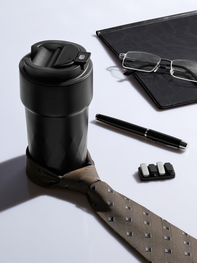Смарт-термостакан в металлическом корпусе с легким рельефом.