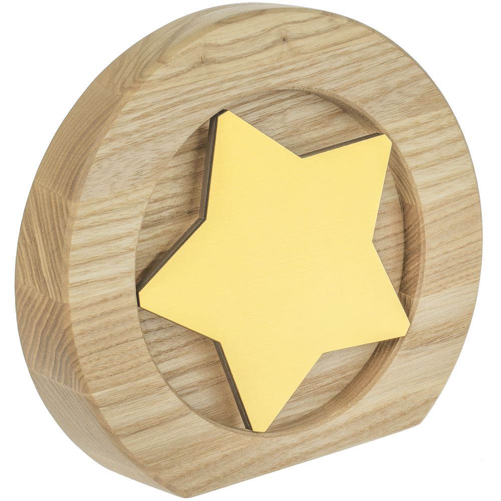 Вставка со звездой из зеркального пластика на деревянной основе крепится на приподнятое основание внутри стелы, что создает объем и многослойность награды. На вставке предусмотрен клеевой слой для крепления после нанесения.