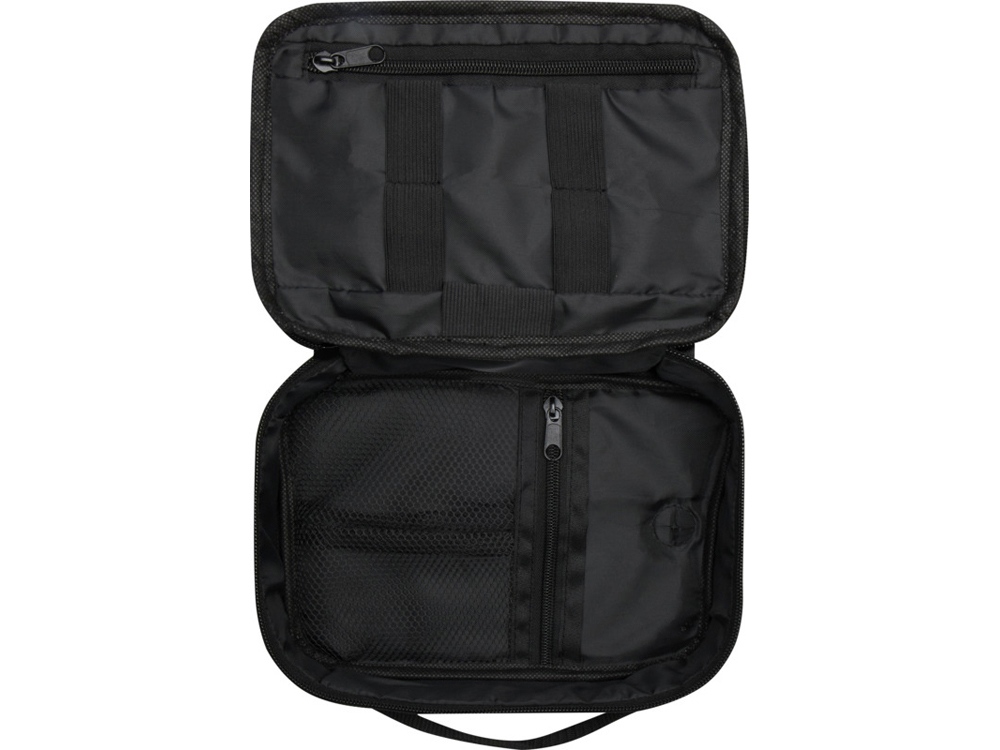 Сумка для техники Ross из переработанного ПЭТ, соответствующего стандарту GRS, идеально подходит для людей, постоянно находящихся в пути, и позволяет организовывать портативные зарядные устройства, зарядные кабели или любые другие электронные аксессуары. Имеет несколько карманов, эластичных петель и вставок для протягивания кабелей, позволяющих заряжать телефон, храня портативное зарядное устройство в сумке. Также имеет пластиковый карабин для крепления к другой сумке. Емкость: 1 литров. 300DGRS certified recycled polyester.