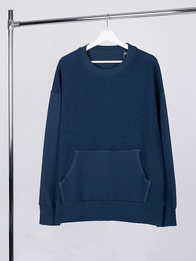 Благодаря особой конструкции, где часть деталей — перед и спинка — вывернута наизнанку, свитшот приобретает запоминающийся вид. Так внутренняя, обычно незаметная сторона материала превращается в лицевую: миниатюрные петельки бывшей изнанки становятся настоящим украшением толстовки, добавляя ей оригинальности и эффект невероятно приятной плюшевости.