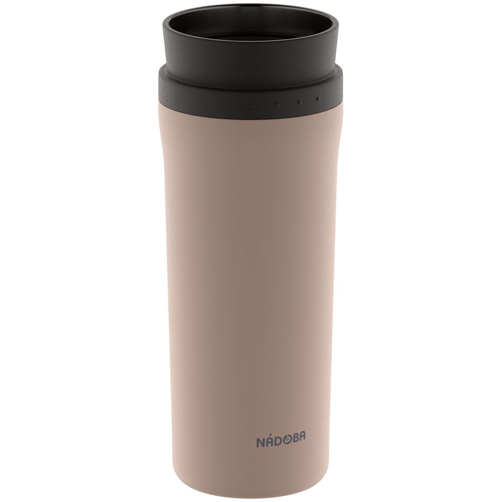 Стильная термокружка с металлическим корпусом и удобным клапаном для питья.