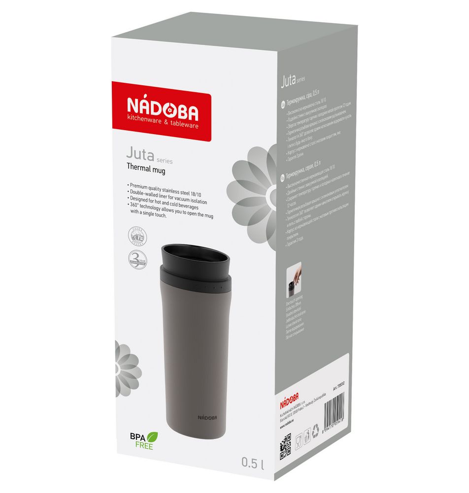 - Герметичная завинчивающаяся крышка с силиконовым уплотнителем и питьевой системой с клапаном — технология 360° позволяет одним нажатием открывать кружку и пить с любой стороны
