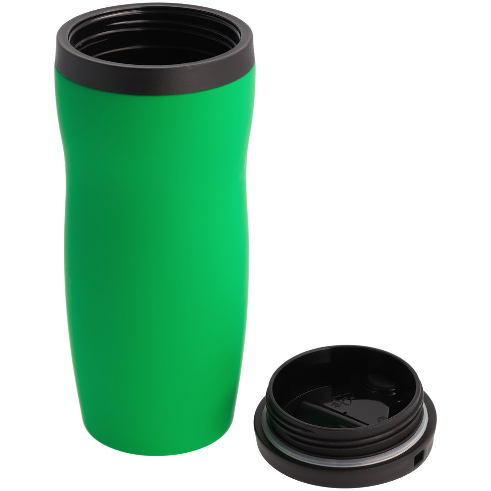 Двухслойная конструкция из нержавеющей стали снаружи и пищевого пластика внутри. Герметичная завинчивающаяся крышка с откидным клапаном для питья. Покрытие софт-тач. В отверстие в крышке можно вставить шнурок для удобного ношения стакана на руке. Шнурок в комплект не входит.
