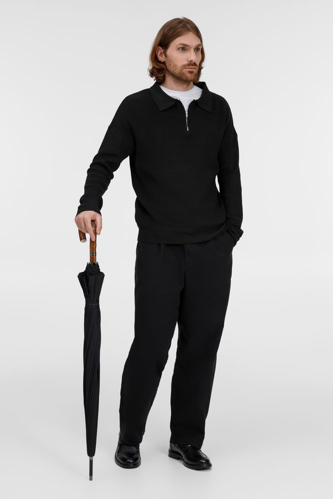 Солидный изысканный зонт с ручкой из дерева и 16 спицами. Большой купол легко укроет от дождя сразу двоих, а надежная конструкция выдержит даже сильный ветер.