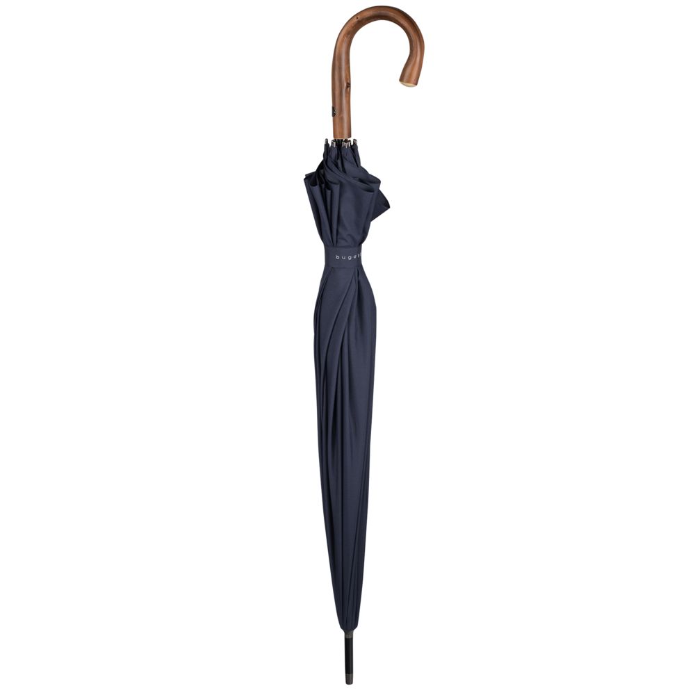 Солидный изысканный зонт с ручкой из дерева и 16 спицами. Большой купол легко укроет от дождя сразу двоих, а надежная конструкция выдержит даже сильный ветер.