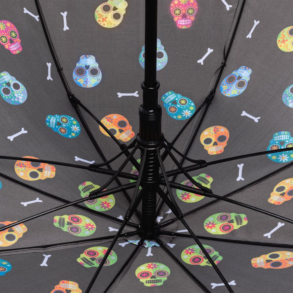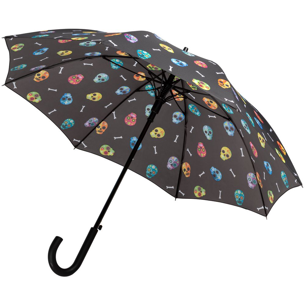 Зонт-трость с веселыми черепами-калаверами — символом мексиканского Дня мертвых — наполнит ваши прогулки под пасмурным небом атмосферой ярчайшего латиноамериканского фестиваля. Дождю не испортить ваш внутренний праздник!Зонт-полуавтомат, 8 спиц.